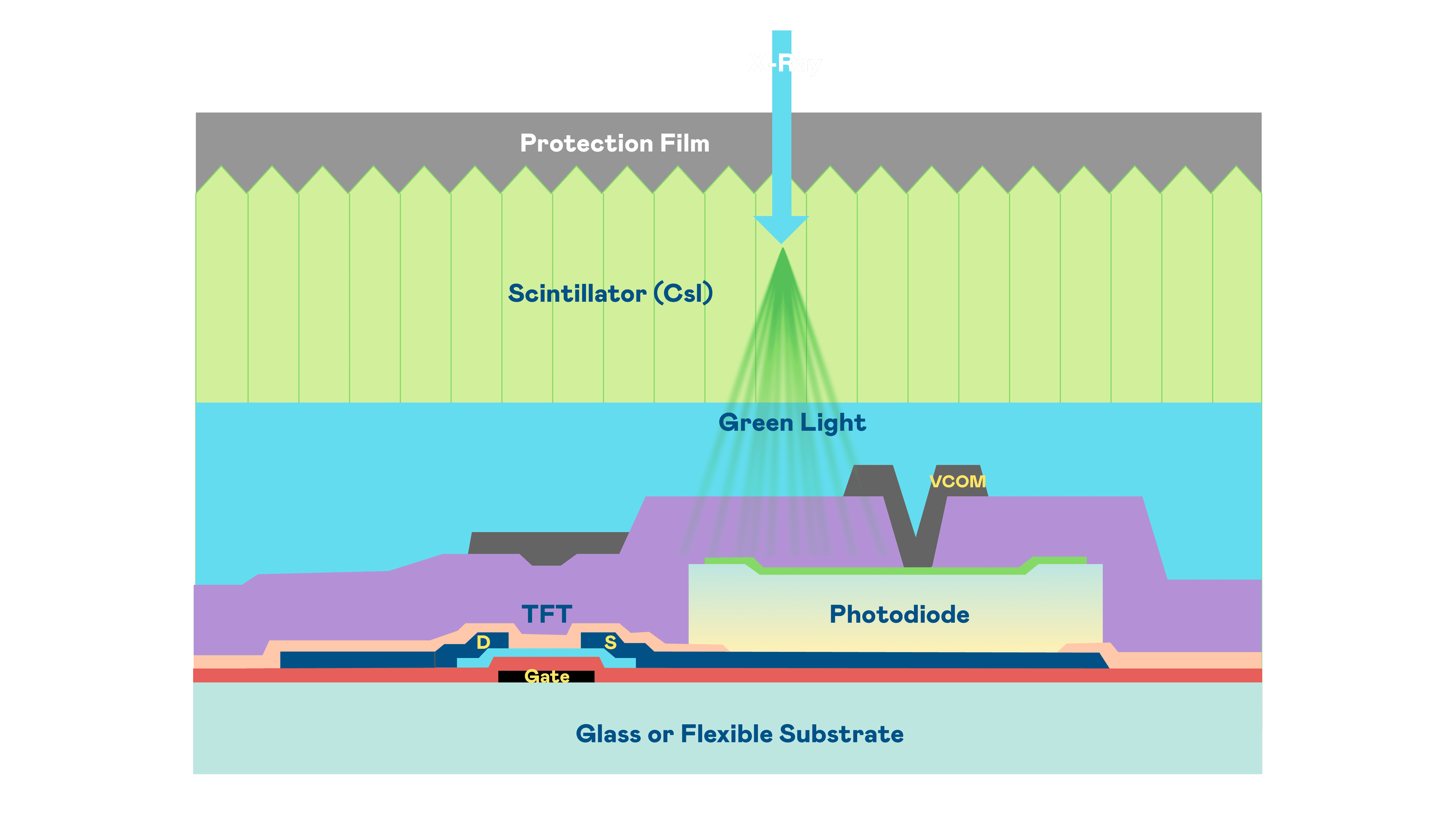 人生就是博的X光影像感测阵列使用薄膜电晶体 (TFT) 作为每个像素的读取开关,,,,搭配光电二极体(Photodiode)的光电转换元件,,用以感测X光影像讯号。。