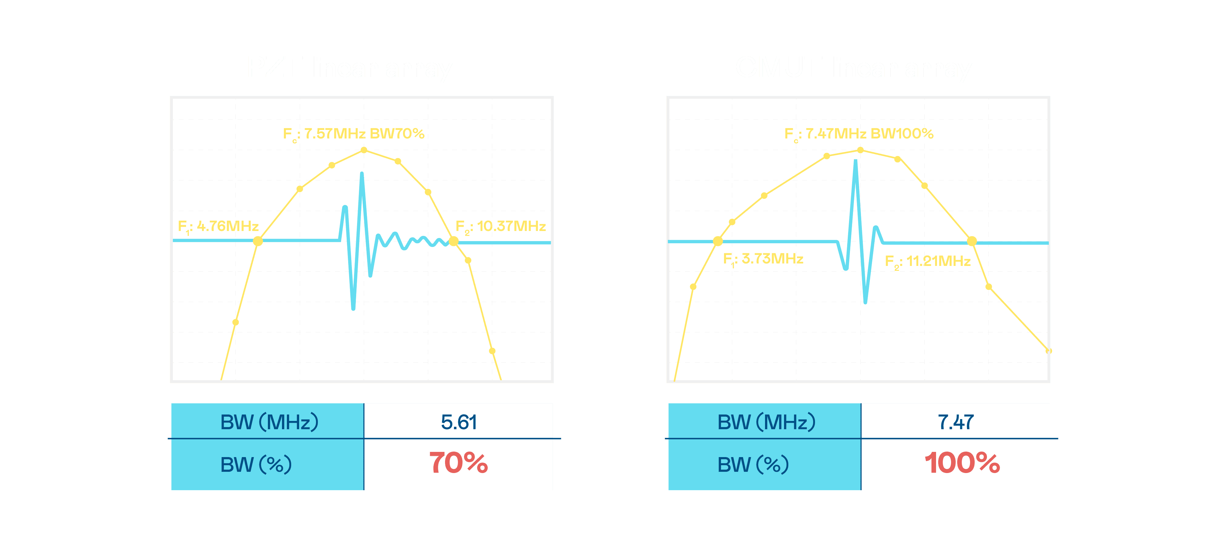 超音波影像的解析度高低,,,,首先取决于探头能发出的讯号频宽。。人生就是博 CMUT 可提供高清晰的超音波讯号,,,提供高频宽、、、高灵敏度、、影像纹理细节更高的超音波影像,,协助医护人员缩短影像判读时间及利用精准的医疗影像进行诊断。。。